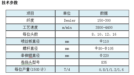 滌綸FDY紡絲機(jī):設(shè)備主要用于生產(chǎn)滌綸FDY全牽伸絲,該絲主要用于服裝、床上用品、裝飾用品、產(chǎn)業(yè)用的土工布、過(guò)濾布等。